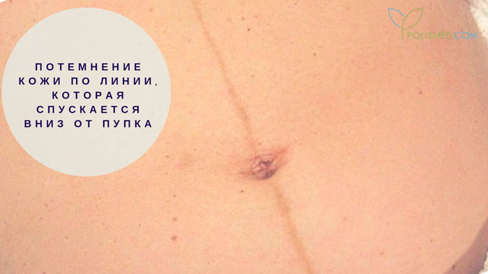 · Повышенная пигментация кожи в определенных зонах. Например, кожа темнеет в области сосков, по линии, которая спускается вниз от пупка. Скорее всего, эти пятна исчезнут сразу после рождения ребенка.