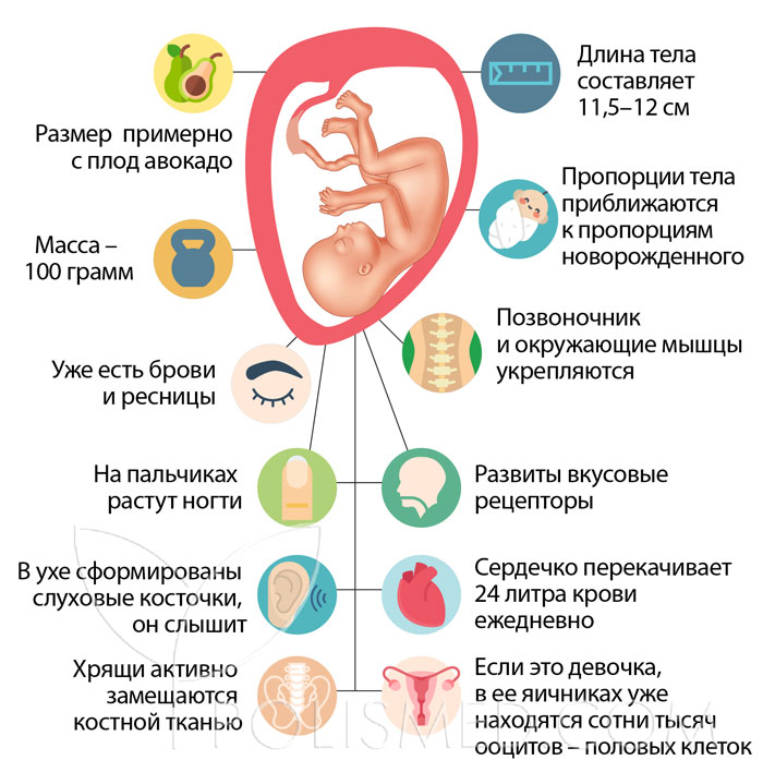На 16 неделе ваш будущий малыш размером примерно с плод авокадо. Длина его тела составляет 11,5–12 см, масса – 100 грамм.