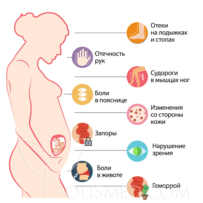 Геморрой возникает из-за того, что матка сдавливает вены и нарушает отток крови от области таза. Из-за нарушения оттока крови от ног, на них могут появиться варикозно расширенные вены.