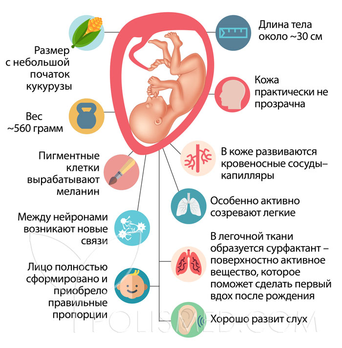На двадцать четвертой неделе беременности будущий ребенок размером с небольшую дыню, или с початок кукурузы. Его весит от 500 грамм до 1,3 кг, неуклонно набирая до 160 грамм в неделю, рост – около 30 см.