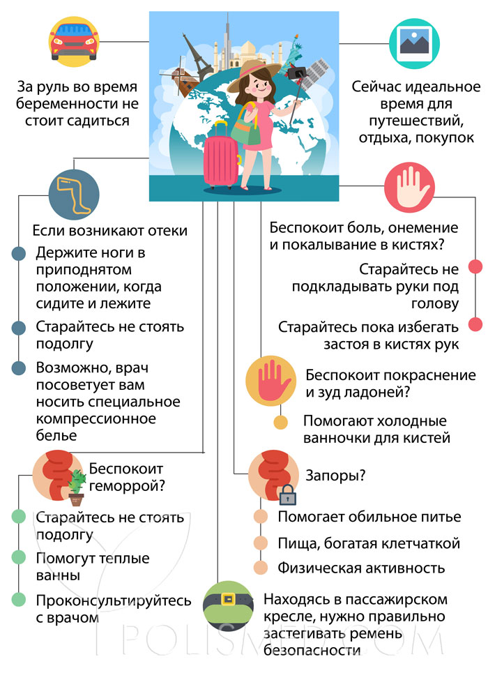 · За руль во время беременности не стоит садиться вообще. Согласно статистике, беременные женщины попадают в аварии намного чаще. Находясь в пассажирском кресле, нужно правильно застегивать ремень безопасности. Нижняя лямка должна находиться под вашим животом и охватывать бедра, верхняя – между молочными железами, по центру грудной клетки, а не в подмышке.