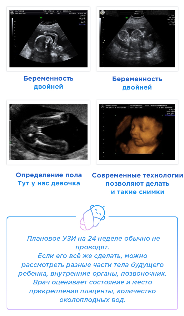Плановое ультразвуковое исследование на двадцать четвертой неделе не проводят. Исследование назначают лишь при повышенном риске некоторых осложнений, например, преэклампсии.