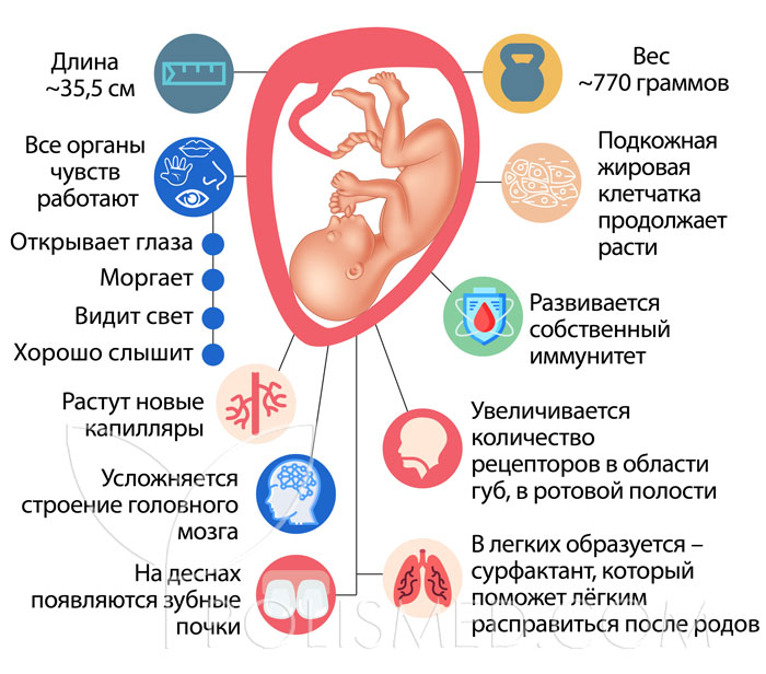 Сейчас плод практикует практически все движения, которые пригодятся ему в самостоятельной жизни. Например, он активно толкается ножками – можно считать это первой пробной ходьбой. Иногда будущий ребенок переворачивается и упирается ногой прямо в ваши ребра. Ощущения при этом возникают не из самых приятных. Вы можете изменить положение тела, встать, походить, или мягко подтолкнуть малыша рукой.