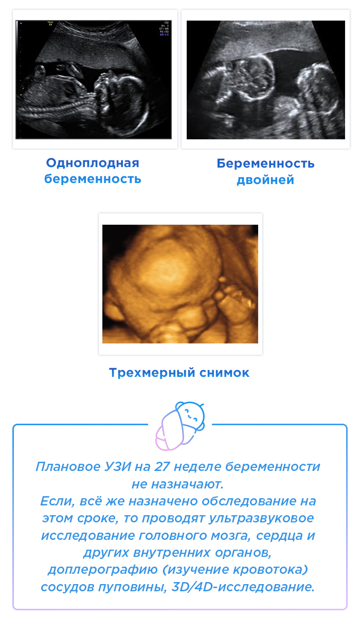 Плановое УЗИ на 27 неделе беременности не назначают. Ультразвуковое исследование может потребоваться в случаях, если беременность протекает с некоторыми осложнениями. Например, если врач обнаруживает, что живот женщины вырос слишком мало, и возникает подозрение на задержку внутриутробного развития.