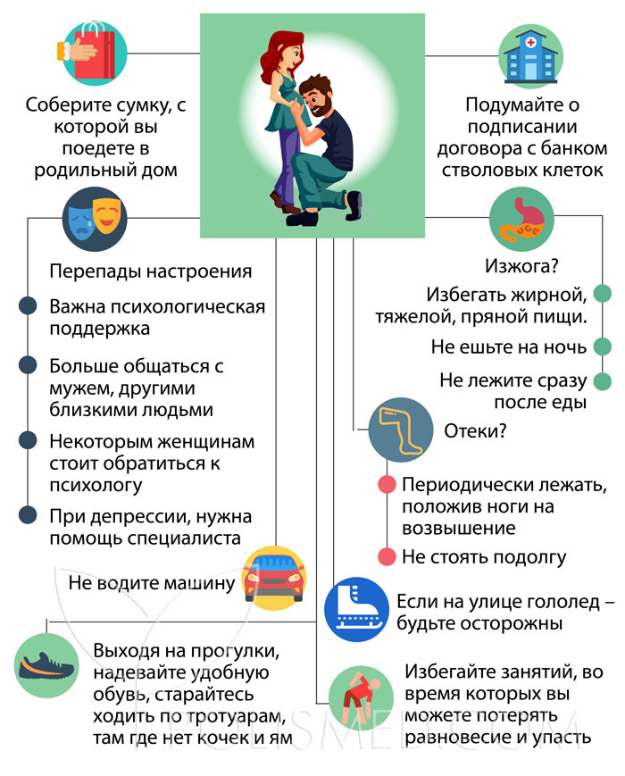 · Сейчас, когда стали частыми и резкими перепады настроения, для будущей мамы особенно важна психологическая поддержка. Нужно больше общаться с мужем, другими близкими людьми, рассказывать им о своих переживаниях, проблемах. Некоторым женщинам стоит обратиться к психологу. Если плохое настроение сохраняется очень долго, это может свидетельствовать о депрессии, нужна помощь специалиста.