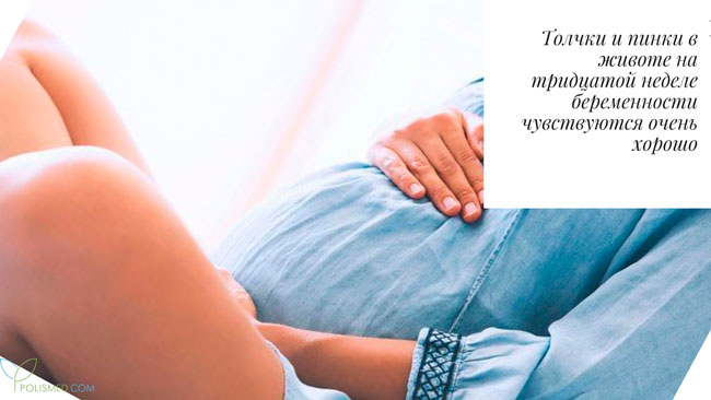 Толчки и пинки в животе на тридцатой неделе беременности чувствуются очень хорошо. Их можно почувствовать, если положить руку на живот, и даже увидеть. Иногда плод упирается в стенку матки ягодичками – это тоже хорошо ощущается рукой через кожу. Особенно неприятные и даже болезненные ощущения возникают, когда малыш «ставит ножку под ребро».