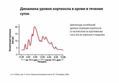 Три раза в течение дня — ранним утром, примерно в середине дня и вечером — уровень кортизола повышается. График показывает изменения уровня этого гормона в течение суток. Обратите внимание, что самое высокое содержание кортизола в крови приходится на