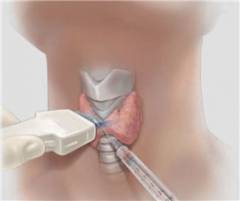 | Пункционная биопсия | После проведения биопсии можно точно установить, какие клетки входят в состав узла. Диагноз после этого не оставляет сомнений. Кроме того, можно выявить на ранней стадии злокачественную опухоль железы. Точность метода составляет 80%. Во время исследования врач вводит в узел иглу и получает фрагмент ткани. Материал отправляют в лабораторию для изучения клеточного состава. | Техника проведения пункционной биопсии: