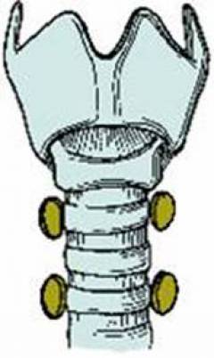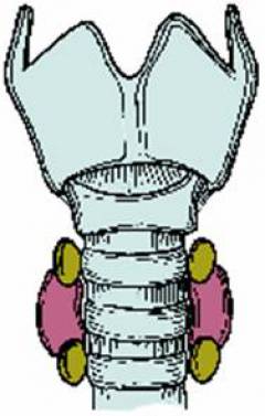 Орган прилегает спереди и по бокам к щитовидному хрящу гортани. Щитовидная железа имеет небольшие размеры и мягкую консистенцию, но все же ее можно прощупать под кожей, если попросить пациента наклонить голову вперед.