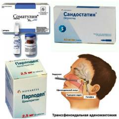 Медикаментозное лечение основано на угнетении выработки соматотропного гормона гипофизом. Основными препаратами являются: