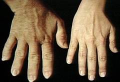 - Удлинением конечностей рук, ног. Чрезмерный рост ног, при сочетании непрочного костного каркаса и повышенной нагрузки, обуславливают появление искривления в области коленных суставов. Ноги становятся Х образными. Увеличиваются в размерах и утолщаются кисти, стопы.