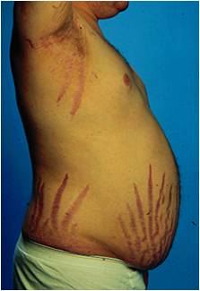 Кожа. Кожные покровы становятся сухими, багрово-мраморными, шелушатся. В местах сильного трения отмечается усиление пигментации. В области ягодиц, бедер, живота, молочных желез, подмышечных впадин выделяются широкие полосы сине-фиолетовых до темно-красных оттенков. Их появление связано с разрушением белков под действием усиленной выработки глюкокортикоидов (гормонов надпочечников). Кожа истончается до такой степени, что видны кровеносные сосуды. Сами сосуды ломки, что любое воздействие на них вызывает повреждения. По этой причине у больного можно увидеть кровоподтеки и раны различной величины и глубины, которые очень долго заживают. Нельзя не отметить 2 важных симптома – гирсутизм и вирилизм - оба развиваются в результате повышенного содержания андрогенов.