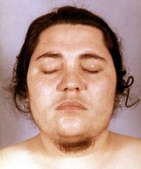 Подкожная жировая клетчатка и ожирение. Ожирение является одним из основных симптомов и встречается в 95 % случаев. Перераспределение его по всему телу не одинаково. Лицо приобретает округлую форму, напоминающую луну («лунообразное лицо). Другим отличительным признаком может быть отложение жира в области седьмого шейного позвонка в виде небольшого холмика («климактерический горбик» или «буйволовый тип»). Этот позвонок, точнее его отросток, можно прощупать сзади на шее (самую выступающую часть), если сильно наклонить голову вперед. Значительное утолщение подкожно - жирового слоя происходит также в зоне живота и груди. Все эти признаки объясняются действием в повышенном содержании кортизола (гормона надпочечника), который способствует ускоренному образованию липидов (
