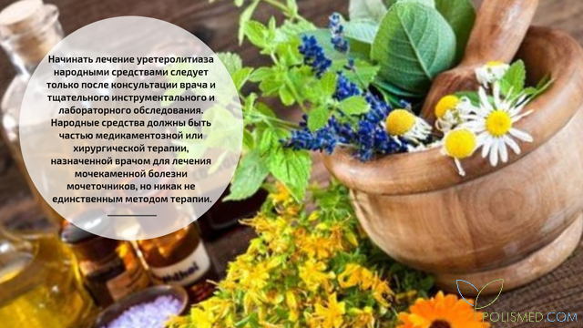 Начинать лечение уретеролитиаза народными средствами следует только после консультации врача и тщательного инструментального и лабораторного обследования. Народные средства должны быть частью медикаментозной или хирургической терапии, назначенной врачом для лечения мочекаменной болезни мочеточников, но никак не единственным методом терапии.