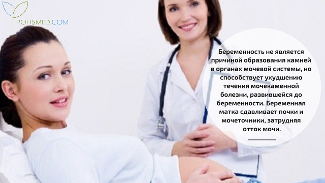Беременность не является причиной образования камней в органах мочевой системы, но способствует ухудшению течения мочекаменной болезни, развившейся до беременности. Беременная матка сдавливает почки и мочеточники, затрудняя отток мочи. Такие изменения во время беременности как гормональная перестройка, повышение концентрации солей в моче, нарушение уродинамики, эндокринные нарушения, изменение водно-солевого обмена способны ускорить образование камней. Пациентка в течение всей беременности должна находиться под наблюдением уролога.