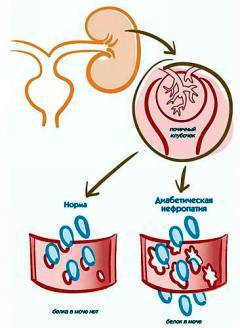 Сахарный диабет На фоне повышенного уровня сахара в крови образуются сложные соединения, которые откладываются на внутренней стенке сосудов (в первую очередь — мелких), повреждая их. В результате сосудистая стенка отекает и уплотняется, а ее проницаемость повышается. Поэтому в мочу попадает белок (развивается диабетическая нефропатия).
