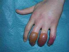 - Необратимые изменения редко распространяются выше лучезапястных и голеностопных суставов, ввиду хорошего кровоснабжения предплечий и голеней.