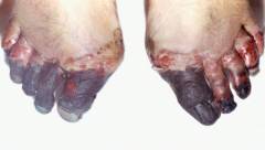 | IV | Поражается вся конечность, вплоть до костей и суставов. Развивается сухая гангрена. | Кожные покровы серо-черного цвета. Отмороженная часть конечности усыхает и отделяется от здоровой ткани. В приграничной ткани отек и признаки воспаления. При отсутствии своевременного хирургического вмешательства и контроля заживаемости раны велик риск гнойных осложнений. | ![]() |