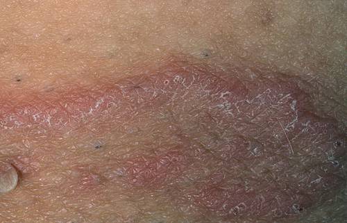 Инвертная форма характеризуется расположением очагов поражения в складках кожи. Проявлениями данной формы обычно являются покраснение, шелушение и незначительный зуд.