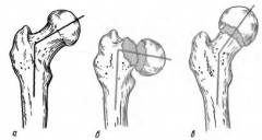 - вальгусный перелом – головка смещается вверх и кнаружи, а угол между шейкой и телом кости увеличивается;