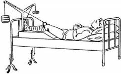 - наложение на ногу скелетного вытяжения, обычно массой 6 – 8 кг, лечение в условиях стационара;