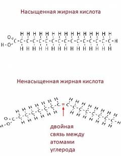 Ненасыщенные жирные кислоты – это входящие в жир молекулы углеводородов, в которых связи между углеводородными звеньями не насыщены водородом и содержат двойные связи между звеньями углеводородов. Благодаря такой структуре растительные жиры имеют жидкую консистенцию.