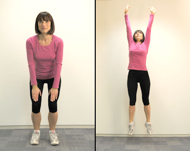| 1 | Прыжки вверх (выпрыгивания) Для данного вида прыжков займите начальную позицию: ступни зафиксируйте на ширине плеч, ноги незначительно согнуты в коленях (колени при этом направлены только вперед), руки расположены на коленях. Теперь сделайте прыжок на месте вверх, вытягивая вверх руки и стараясь вытянуть все тело за ними. Мягко приземлитесь, немного пружиня. Опять займите исходное положение и повторите прыжок. Для большей нагрузки вы можете сделать более глубокое приседание перед прыжком. Или при упражнении держите в обеих руках бутылку с водой или другой дополнительный вес — удерживайте его на середине груди. | Выполнять в 2 захода по 15-25 повторений. | Для приведения пульса к нормальному ритму выполняйте ходьбу или не утомляющий бег на месте в течение 20-45 секунд. |