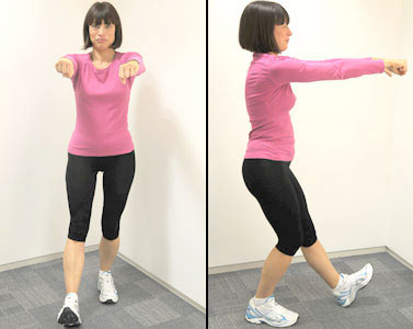 Приседания ![]() С меньшей нагрузкой можно выполнить несколько приседаний. Расположив ноги на ширине плеч, сгибайте колени до тех пор, пока бедра не будут практически параллельны полу. При этом спина сохраняется прямой, а руки вытянуты вперед. Не давайте своим коленям выйти вперед над носками. |