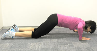 | 1 | Отжимания на три четверти Примите упор на полу на руках следующим образом: локти разведите в стороны и по линии плеч положите ладони на пол. Пальцы обращены вперед, ладони расправлены, а локти разведены в стороны как можно шире. Коленями опирайтесь о пол, голени лежат на полу. Ступни можно поставить на носки. Сгибая локти, вы будете опускать плечи и торс к полу, но — не более чем 5 сантиметров от плоскости пола. А теперь оттолкнитесь от пола и выпрямите руки, не отрывая ладони от пола. Далее повторяйте эти движения. ИЛИ Полноценные отжимания Примите упор на полу на прямых руках. При этом ладони расправлены, устойчиво расположены, и пальцы направлены вперед. Ладони находятся на линии плеч. Ноги прямые, ступни стоят на носках. Постарайтесь крепко и устойчиво установить ступни. Можно упереть их сзади к стене или какому-либо другому статичному объекту. Начинайте движение торса вниз, сгибая руки в локтях. При этом локти разводятся в стороны. Сгибайте руки до тех пор, пока плечо и предплечья не образуют прямой угол между собой. Не прогибайте поясницу, спину и ноги — подобно тому, как вы это делали на предыдущей неделе в упражнении «планка». Опускаться к полу следует не ниже чем 5 сантиметров от поверхности пола. После этого оттолкнитесь от пола, упираясь ладонями и носками ног, и распрямите руки. Затем повторяйте эти движения. | Отжимания выполняются по 12-16 повторений в 2 подхода. |