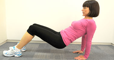 | 2 | Отжимания в упоре сзади (работа трицепсов) Для этого упражнения садитесь на пол, затем согните колени и поставьте ноги примерно на ширине ваших бедер. Удобно и устойчиво установите ступни. Прямые руки поставьте на пол, заведя их немного за спину. Руки расположены параллельно друг другу, а ладони и пальцы направлены вперед, так же как и голова. Не отставляйте руки далеко от тела. Смотреть нужно перед собой. Для начала движения поднимите ягодицы над полом. А теперь медленно и внимательно сгибайте локти так, чтобы ваше тело и ваши ягодицы опускались обратно к полу. Тем же образом приподнимитесь опять, распрямляя руки. Лучше всего и безопаснее, если вы не будете полностью разгибать локти, а оставите их едва согнутыми. Упражнение выполняется посредством таких сгибаний-разгибаний локтей. Чтобы заставить свои трицепсы работать больше, вы можете упереть ладони в какую-либо устойчивую поверхность немного выше уровня пола — скамью, например. | Отжимания в упоре сзади выполняются по 12-16 повторений в 2 подхода. |