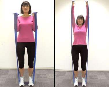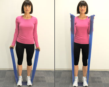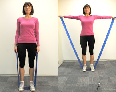 | 6 | Разведение рук в стороны с их подъемом Как и в предшествующем упражнении стойте прямо и установите ноги на ширине ваших бедер. В этом упражнении фитнес-ленту вам требуется поместить сразу под обе ноги. Также подберите живот, напрягите живот и ягодицы. Чтобы проверить, ровная ли у вас спина, сделайте большой вдох и почувствуйте, как разворачиваются и опускаются ваши плечи — это и есть правильное положение спины. Концы ленты зажмите в ладонях, ладони направлены к телу. Руки вытянуты вдоль тела вниз. Медленно и осторожно поднимайте руки вверх, удерживая их прямыми, не сгибая в локтях. Поднимайте руки до уровня плеч, а затем верните их в начальное положение так же медленно. Следите, чтобы ваши плечи при этом не поднимались, не сутультесь. | Разведение рук в стороны с их последующим подъемом выполняются по 12-25 повторений в 2 подхода. |
