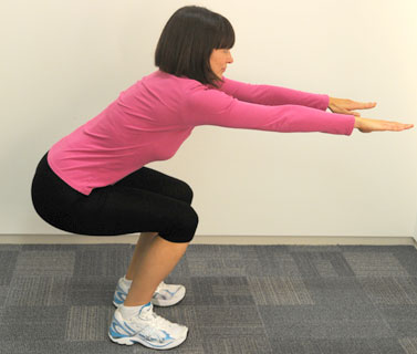 | 7 | Приседания Расставьте ноги на ширине ваших бедер и расправьте плечи. Руки опустите вдоль тела, либо вытяните перед собой для дополнительного равновесия. Опускайтесь вниз, сгибая колени. Опускайтесь до тех пор, пока бедра не образуют с полом практически прямой угол. При этом колени не должны смещаться вперед. Не заваливайтесь назад, не наклоняйтесь вперед, не выгибайте поясницу. Для страховки вы можете выполнять это упражнение, стоя спиной к краю кровати или дивана. Если вы хотите большей нагрузки для ваших мышц, вставая, не разгибайте колени полностью, а начинайте приседать снова. | Приседания выполняются по 15-25 повторений в 2 подхода. |
