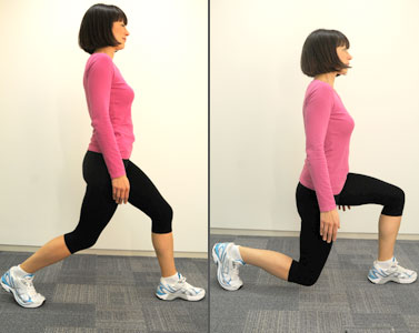 | 8 | Выпады Встаньте в позу «ножницы», сохраняя ровную осанку. При этом левая нога выставлена вперед, а правая отставлена назад. Медленно и внимательно сгибайте колени, опускаясь в положение выпада. Опускаться следует, пока и левая нога, и правая не составят практически прямой угол между бедром и голенью. Фиксируя свой вес на пятках, поднимитесь опять в начальное положение. Не позволяйте коленям сгибаться под острым углом и выступать за линию пальцев стоп. Те же действия произведите с правой ногой. | Выпады выполняются по 15-25 повторений в 1 подход для каждой ноги. |