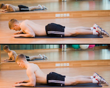 | 3 | Растягивание мышц спины назад Позиция на старте: опираясь на предплечья и ладони, ложитесь на живот. Локти находятся около тела. Расслабьте и вытяните спину и шею. Ноги также вытянуты назад и сведены вместе. Порядок выполнения: удерживая ровную шею и глядя в пол, выгните спину назад в области поясницы. При этом отталкивайтесь от пола руками, разгибая, но — не смещая никуда локти. Вы ощутите небольшое приятное растяжение в мышцах пресса и живота. Задержитесь на этой высоте. Затем верните тело на пол. Важно: не выгибайте шею назад, не отрывайте бедра от пола. Следите за своим равномерным и глубоким дыханием. | Растягивание и мобилизация обменных процессов в тканях позвоночника. ![]() | Растягивания мышц спины в данном случае выполняются на протяжении 6-10 секунд за один подход. Выполните 8-10 подходов подряд. |