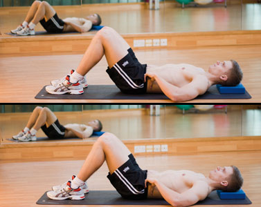 | 4 | Укрепление глубоких мышц брюшного пресса Позиция на старте: находясь лежа на полу, положите под голову небольшую плоскую подушечку, сложенное полотенце или книгу. Колени расставлены немного уже, чем ширина бедер, и согнуты. Стопы плотно установлены на пол. Расслабьте все мышцы торса и немного втяните в себя подбородок. Для устойчивости положения разместите руки на талии. Порядок выполнения: теперь, на выдохе, втяните низ живота в себя, напрягая мышцы нижнего пресса. Представьте, что вы собираете живот будто «в гармошку». Продержите это напряжение, затем расслабьте опять все мышцы. Важно: это упражнение дает медленное и безопасное укрепление мышц нижнего пресса, поэтому напрягать («собирать в гармошку») эти мышцы вас следует не более, чем на четверть от своего максимально возможного усилия. Удостоверьтесь, что при осуществлении этого упражнения у вас нет напряжения мышц шеи, плеч и ног. | Укрепление глубоких мышц, поддерживающих позвоночник. ![]() | При укреплении глубоких мышц пресса вам потребуется удерживать сокращение этих мышц, пока вы не сделаете 5-10 спокойных вдохов и выдохов. После минутного отдыха повторите это сокращение, и так 5 раз. |