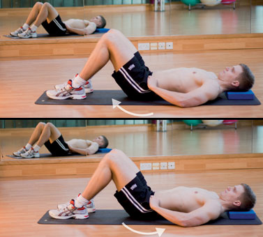 | 5 | Наклоны (смещения) таза Позиция на старте: находясь лежа на полу, положите под голову небольшую плоскую подушечку, сложенное полотенце или книгу. Колени расставлены строго по ширине бедер и согнуты. Стопы плотно установлены на пол. Расслабьте все мышцы торса и немного втяните в себя подбородок. Порядок выполнения: мягко прижмите вашу поясницу к полу и напрягите немного мышцы брюшного пресса. Теперь постарайтесь чуть сместить свой таз вперед, по направлению к пяткам. Вы почувствуете небольшое выгибание поясницы и работу мышц спины — сокращение и расслабление. Важно: при наклонах таза обязательно должны работать глубокие мышцы брюшного пресса. А вот шея, ноги и плечи не должны напрягаться и излишне прижиматься к полу. | Растягивание и укрепление пояснично-крестцового отдела спины. Чтобы почувствовать правильную работу мышц спины, при выполнении упражнения положите одну ладонь на свой брюшной пресс, а другую подложите под поясницу. ![]() | Данные смещения таза выполняются по 12-16 раз в течение одного подхода, при этом таз совершает медленные как бы качающиеся движения. |