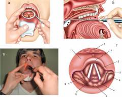 - во время исследования пациента просят сказать «а-а-а» - при этом раскрываются голосовые связки, что облегчает осмотр.