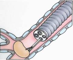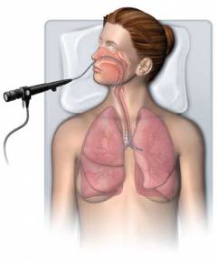 - Бронхоскоп вставляют в нос (иногда в рот), продвигают в гортань, затем в трахею и бронхи.