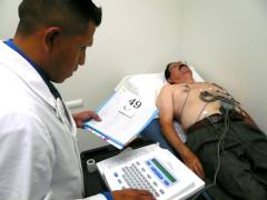 | Электрокардиография (ЭКГ) | Исследование предназначено для оценки состояния сердца при раке гортани. Входит в обязательную программу диагностики. | Пациента укладывают на кушетку, помещают на руки и ноги, грудную клетку электроды. Аппарат фиксирует электрические импульсы сердца в виде электрокардиографической кривой. Она может выводиться на ленту или (у современных приборов) на монитор компьютера.![]() |