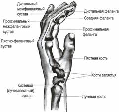- Пальцы. Каждый палец имеет три фаланга: проксимальный (основание пальца), срединный и дистальный (концевая фаланга). Исключение — большой палец, имеющий только две фаланги (проксимальную и дистальную).
