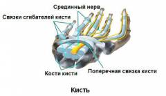 Кисть — часть руки человека, имеющая три отдела: - Запястье состоит из восьми небольших костей неправильной формы, расположенных в два ряда в разных плоскостях. Таким образом, они образуют желоб (борозду или дугу) с внутренней стороны ладони. Дуга выпуклостью обращена к тыльной (наружной) стороне кисти, а с ладонной стороны ее покрывает удерживатель (поперечная связка запястья) сухожилий-сгибателей — образование из плотной соединительной ткани.