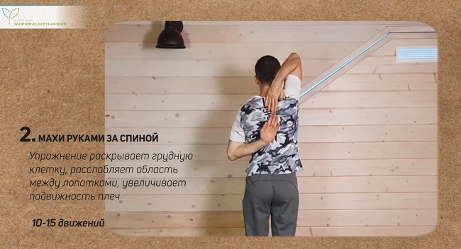 Затем разведите руки в стороны, сделайте вдох, а на выдохе медленно заведите руки за спину вот таким образом, словно пытаетесь сделать замочек.