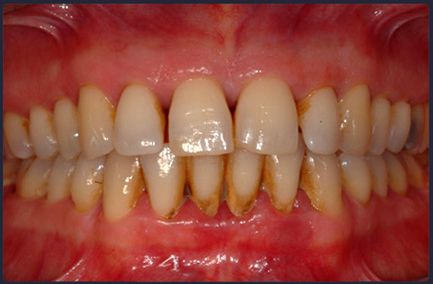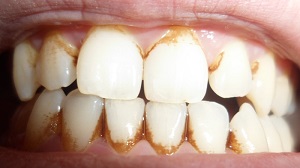 | Бурый налет | «Налет курильщика» образуется при постоянном взаимодействии зубного налета и табачного дыма. Смолы глубоко проникают в толщу плотного налета, окрашивая его. Бурый налет может указывать на общие заболевания, сопровождающиеся высоким содержанием железа в слюне: первичный гемохроматоз (активное всасывание железа в пищеварительном тракте), сиалоаденит (образование камня в слюнной железе). Прием препаратов на основе железа также может вызвать появление налета буро-коричневого цвета. | Повышенная чувствительность зубов связанная с деминерализацией и истощением эмали. Повышенная кровоточивость десен. Неприятный запах изо рта Воспаление десен гингивит. Формирование зубного камня. |